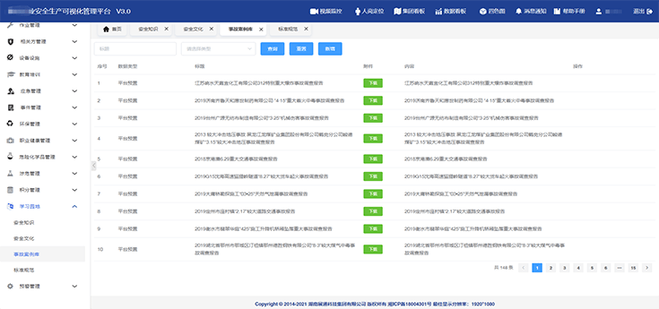系統(tǒng)配置了企業(yè)安全知識、安全文化、事故案例庫、標(biāo)準(zhǔn)規(guī)范4大內(nèi)容模塊,可供企業(yè)各層級工作人員隨時學(xué)習(xí)或開展培訓(xùn),為企業(yè)營造了良好的安全文化氛圍。